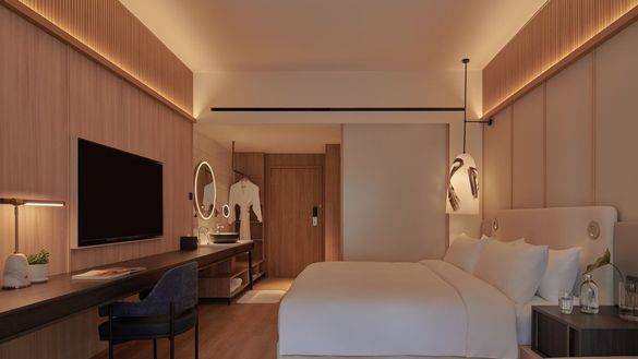 The guest room corridors at Amara Singapore offer a tactile journey through the area's rich historical charm. Intricate wallcoverings are inspired by the textured alleyways of neighbouring shophouses, seamlessly blending past and present. This motif continues into the guestroom, where earthy and natural textures inspire the selection of materials. Light and dark timber laminate, tan leather, and black metal complement each other. The bathrooms feature handcrafted porcelain tiles, evoking the charm of those found in traditional shophouses and adding an artisanal touch to the interior.